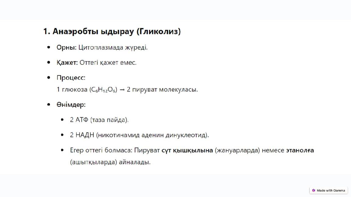 Гликолиздің негізгі кезеңдері мен өнімдері Бастапқы кезеңдер Глюкоза гексозаларға айналып, АТФ пайда болады. Негізгі кезеңдер Гексозалар триоза фосфаттарға ыдырайды, одан ары пируват түзіледі. Негізгі өнімдер Гликолиз нәтижесінде 2 АТФ, 2 NADH және 2 пируват молекулалары түзіледі. Жалпы сипаттамасы Гликолиз - глюкозадан энергия алудың тез және тиімді анаэробты жолы.