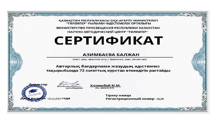 түпнұсқалық сертификаты бар болуы негізінде авторлық бағдарламаның жазылу қағидалары толық сақталған. Қазіргі таңда балаларға сапалы білім
