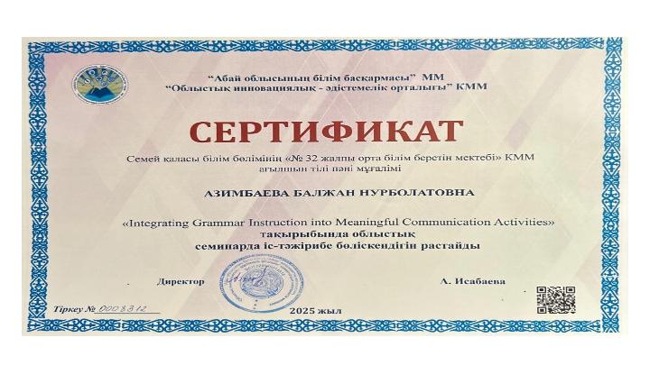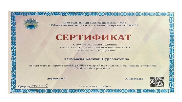Қазақстан Республикасы оқу-ағарту министрлігі Абай облысы Семей қаласы білім басқармасы “№32 жалпы орта білім беретін мектебі” коммуналдық мемлекеттік мекемесі Азимбаева Балжан Нурболатовна педагог-эксперт ағылшын тілі пәні мұғалімі