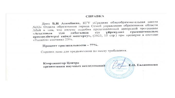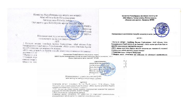Абай облысы білім басқармасы Семей қаласы білім бөлімінің «№32 жалпы орта білім беретін мектеп» КММ кеңес отырысының 2024 ж. «13» қаңтар № 4 ХАТТАМАСЫ Төрайым: А.Е.Сулейменова, «№32ЖОББМ» КММ директоры Хатшы: Маутханова Назым Калкеновна,директордың оқу ісі жөніндегі орынбасары Қатысқандар: Ш.Т.Саяхимова,директордың оқу ісі жөніндегі орынбасары Б.С.Молдаханова,директордың тәрбие ісі жөніндегі орынбасары К.Р.Губайдулин, директордың оқу ісі жөніндегі орынбасары КҮН ТӘРТІБІ: Азимбаева Балжан Нурболатовна ұсынған «Ағылшын тілі сабағында тіл үйренудегі грамматикалық ерекшеліктерді тиімді меңгерту» атты авторлық бағдарламаны талқылау және баспаға ұсыну. Күн тәртібіндегі әртүрлі мәселелер бойынша Тыңдалды: 1.«№32ЖОББМ» КММ директоры А.Е.Сулейменова: Авторлық жұмыс- ағылшын тілі пәні мұғалімдері үшін білім алушылардың грамматиканы түсіну және ережелердегі грамматикалық ерекшеліктерді талдау дағдыларын дамытуға, функционалдық сауаттылықтарын қалыптастырып, ақпаратты өмірде қолдана білу қабілеттерін қалыптастыруға, тест тапсырмаларын шешу дағдыларын жетілдіруге, логикалық және сыни қабілеттерін дамытуға бағытталған көмекші құрал болып табылады. 2.«№32ЖОББМ» КММ директорының оқу ісі жөніндегі орынбасары Ш.Т.Саяхимова: Ұсынылып отырған жұмыстың ережеге сай жазылуы, көшірілмеген түпнұсқалық сертификаты бар болуы негізінде авторлық бағдарламаның жазылу қағидалары толық сақталған. Қазіргі таңда балаларға сапалы білім мен тәрбие беру үдерісіндегі өзекті тақырыптардың бірі болғандықтан бұл құралды білім беру, тәрбие беру мекемелерінде пайдалануға болады деп ұсынамын. ҚАУЛЫ ЕТТІ: Азимбаева Балжан Нурболатовна ұсынған «Ағылшын тілі сабағында тіл үйренудегі грамматикалық ерекшеліктерді тиімді меңгерту» авторлық бағдарлама «Абай облысы білім басқармасы ММ» «Облыстық инновациялық-әдістемелік орталығы» КММ бекітуге және баспаға ұсынылуға жіберілсін. Абай облысы білім басқармасы Семей қаласы білім бөлімінің «№32 ЖОББМ» КММ директоры А.Е.Сулейменова
