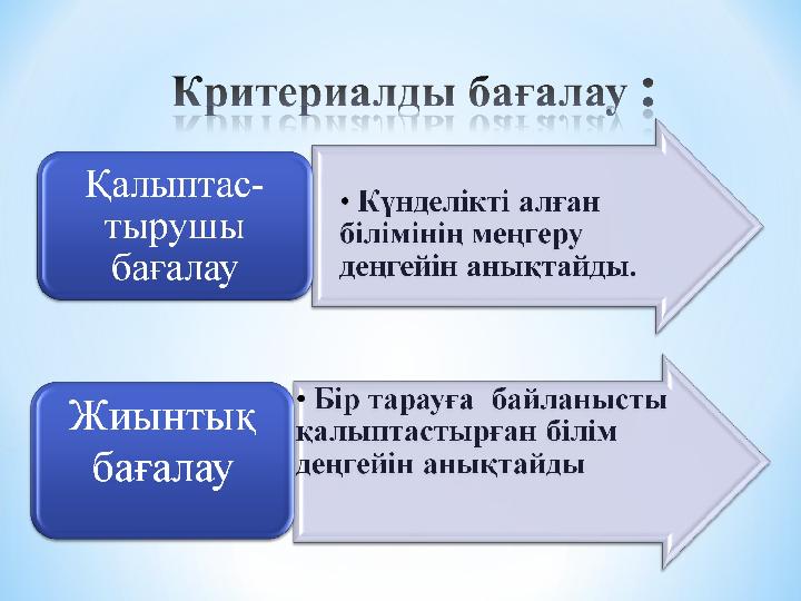 Қалыптастыру шы бағалау Жиынтық бағалау ҚұралдарыКритерий КритерийРубрикатор РубрикаторДискриптор ДискрипторОқытудың міндеттерін жүзеге асыратын өлшемдер, оқушылар жұмыс барысында орындайтын іс- әрекеттер тізбесі Оқытудың міндеттерін жүзеге асыратын өлшемдер, оқушылар жұмыс барысында орындайтын іс- әрекеттер тізбесіОқушының критерийлер бойынша ең жоғары жетістіктерге жету қадамдарын көрсетеді Оқушының критерийлер бойынша ең жоғары жетістіктерге жету қадамдарын көрсетедіОқушының білімін бағалауға арналған критерийлер жиынтығы Оқушының білімін бағалауға арналған критерийлер жиынтығы