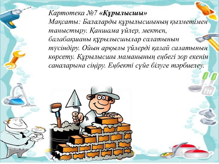 Картотека №6 «Отбасы» Мақсаты: Отбасы мүшелерін білу, олардың отбасында атқаратын қызметін үйрету. Үлкенді сыйлауға, кішіге қамқор болуға тәрбиелеу. Бауырмалдыққа, мейірбандыққа баулу. Өздеріне берген рөлдерді дұрыс орындап, тату ойнауға тәрбиелеу.