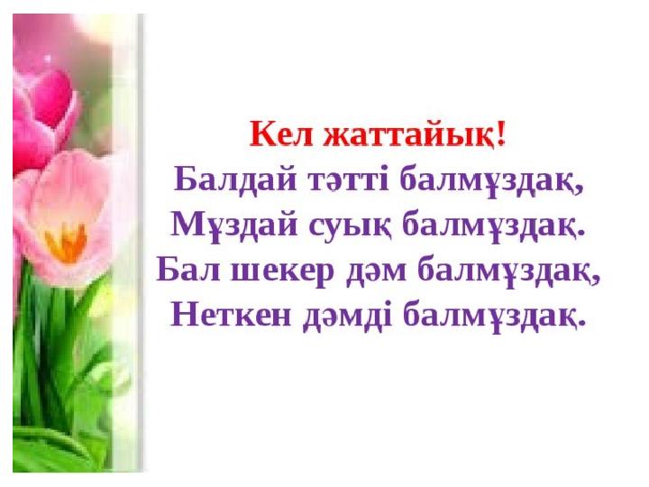 Сабақтың о қу мақсаты: 1.1.3.1. Тыңдаған мәтіннің мазмұны бойынша мұғалімнің көмегімен сұрақтарға жауап беру. 1.Мәтіндегі таныс сөздердің мағынасын түсіну, аудару. 1.5.2.2. Мұғалімнің көмегімен қазақ тіліне тән дыбыстарды дұрыс айту және жазу.