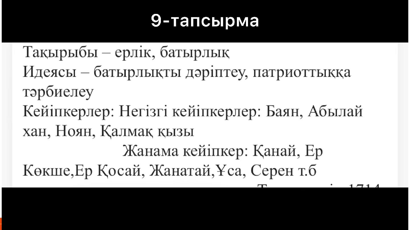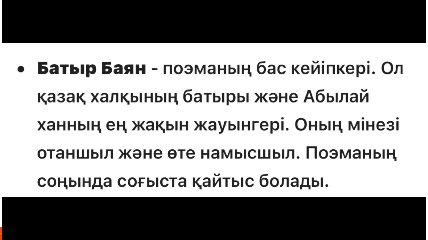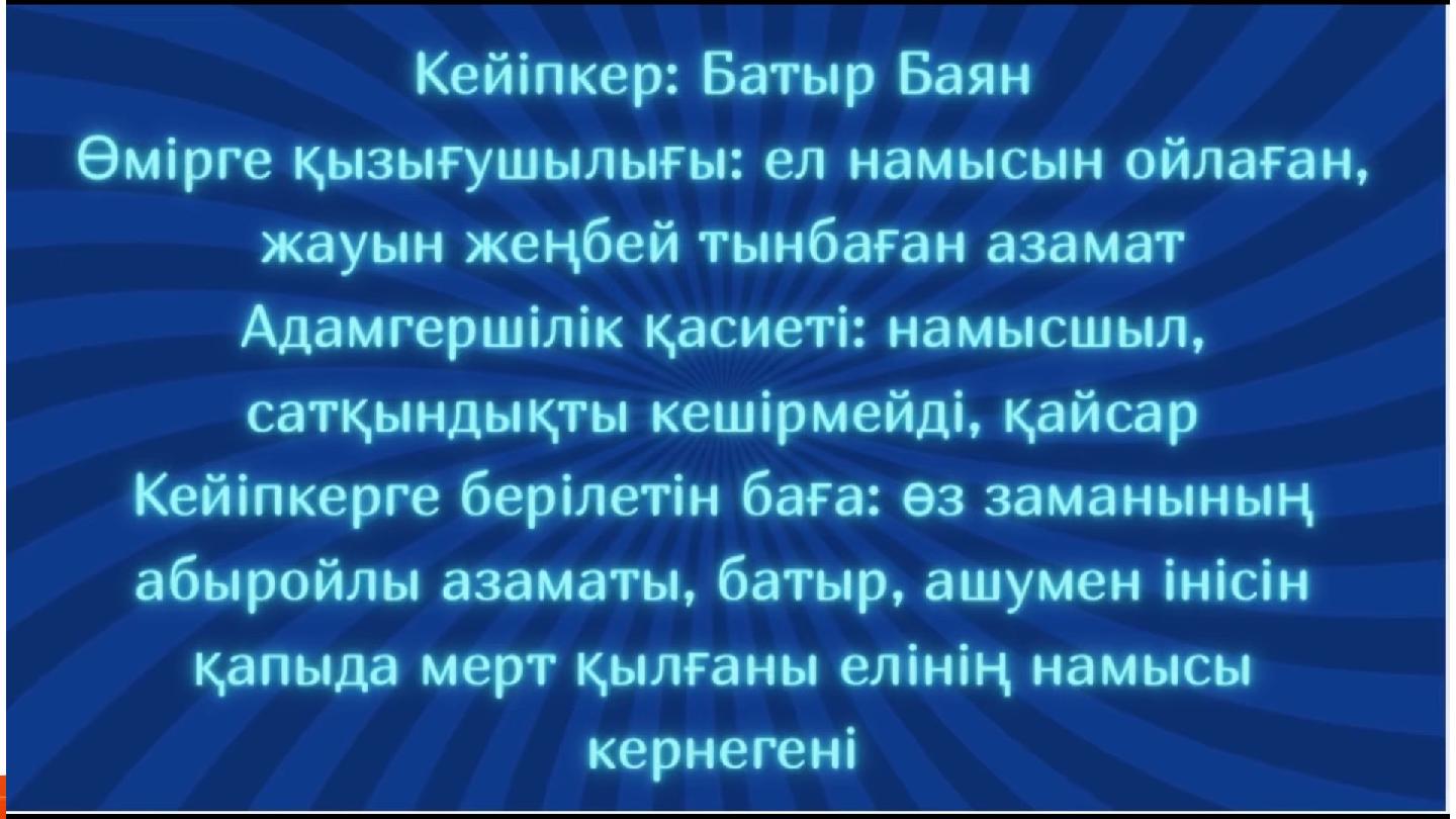 «Батыр Баян» жырының көркемдік ерекшелігі 7.1.3.1. Көркем шығармадағы кейіпкерлердің типтерін жасалу тәсілдері тұрғысынан анықтау; 7.2.3.1. Шығармадағы көркемдегіш құралдардың (символ, синекдоха, қайталау түрлері: эпифора, анафора, аллитерация, ассонанс, риторикалық сұрақ) қолданысын талдау