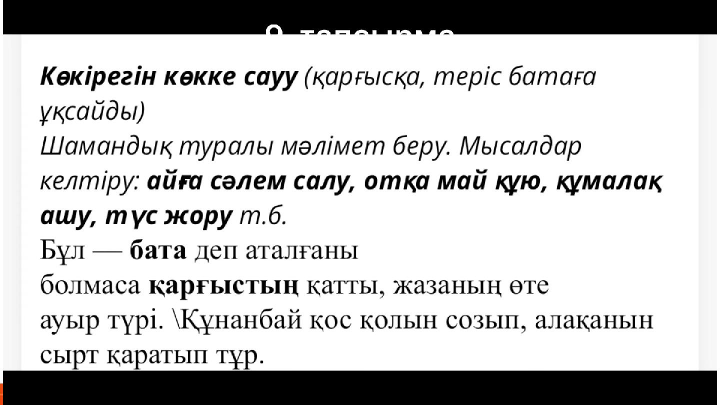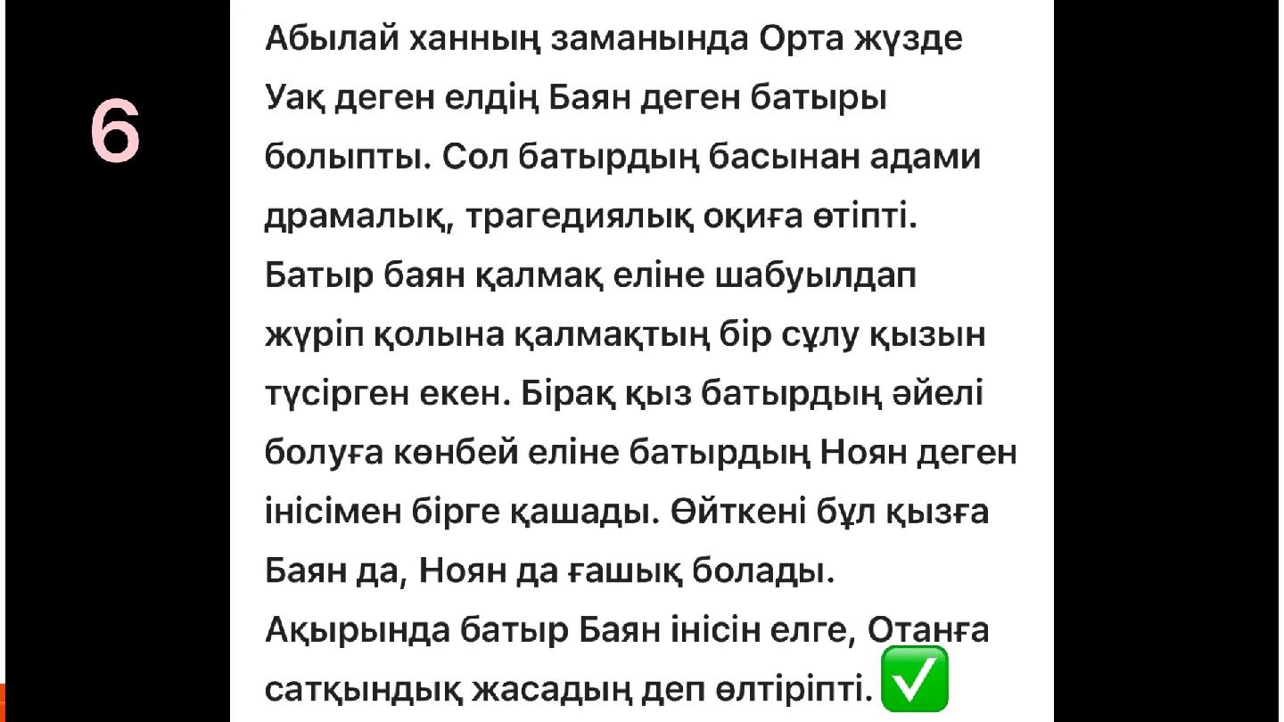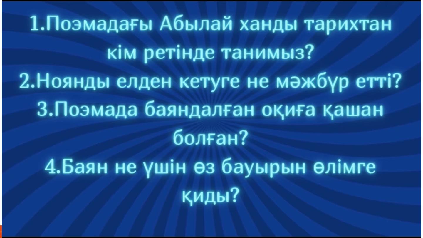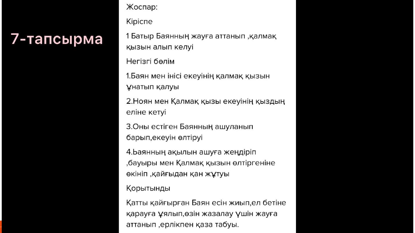 «Батыр Баян» жырының көркемдік ерекшелігі 7.1.3.1. Көркем шығармадағы кейіпкерлердің типтерін жасалу тәсілдері тұрғысынан анықтау; 7.2.3.1. Шығармадағы көркемдегіш құралдардың (символ, синекдоха, қайталау түрлері: эпифора, анафора, аллитерация, ассонанс, риторикалық сұрақ) қолданысын талдау