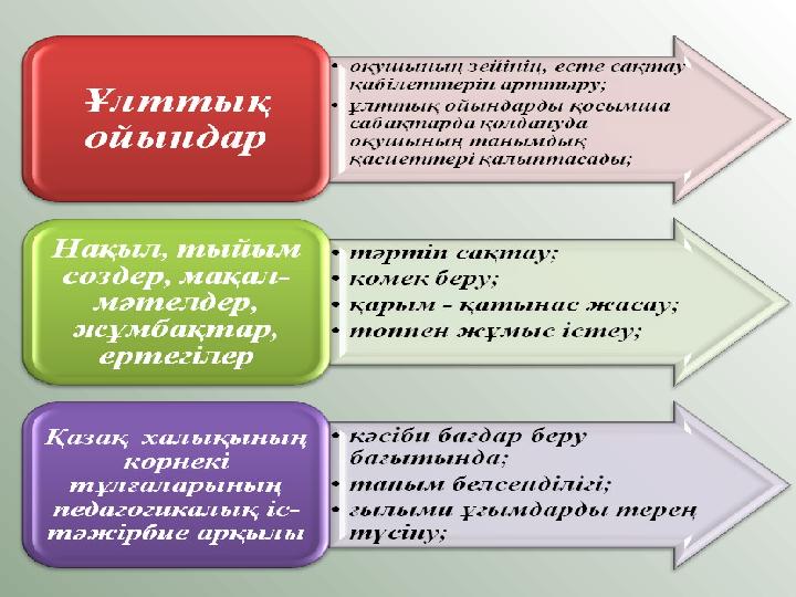 Сабақ барысында халықтық педагогика элементтерін оқушының бойына сіңіру барысында пәнге деген қызығушылықтарын арттыра отырып қазақтың дәстүрлерін қалыптастыру.