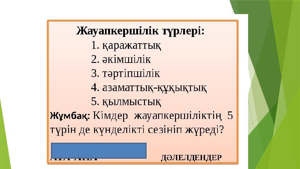 Жауапкершілік-белгілі бір нәрсеге жауапты болушылық, міндетіне алушылық .