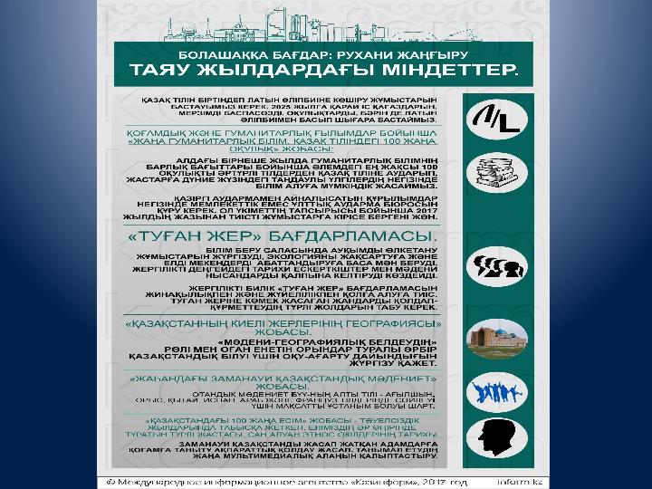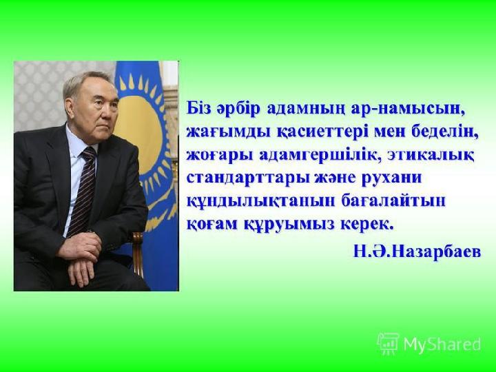 І. ХХІ ҒАСЫРДАҒЫ ҰЛТТЫҚ САНА ТУРАЛЫ •Күллі жер жүзі біздің көз алдымызда өзгеруде. халқымның тағылымы мол тарихы мен ықылым заманнан арқауы үзілмеген ұлттық салт-дәстүрлерін алдағы өркендеудің берік діңі ете отырып, әрбір қадамын нық басуын, болашаққа сеніммен бет алуын қалаймын.