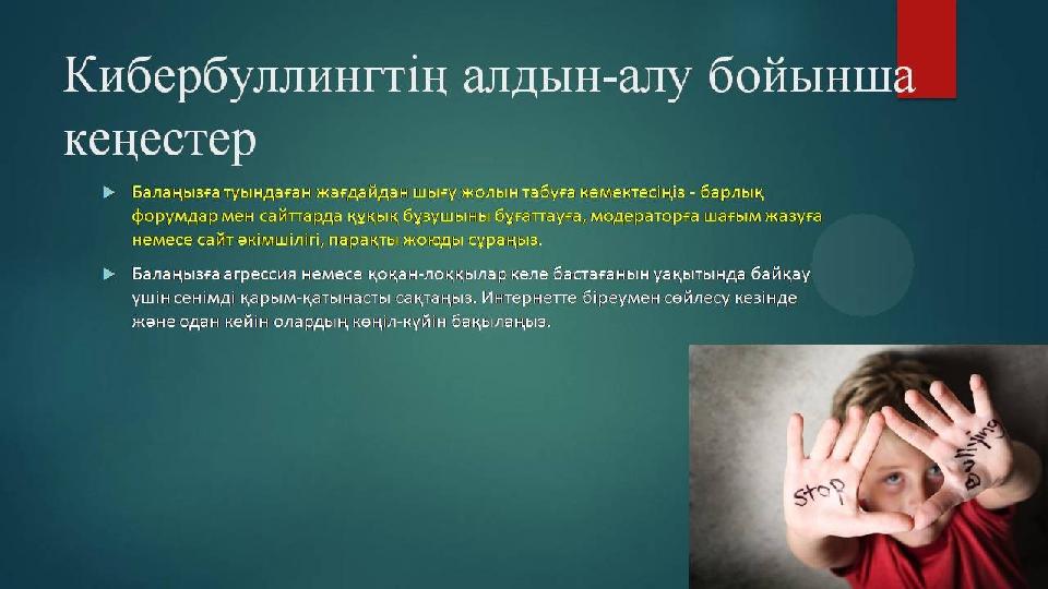 Егер сен кибербуллинг ке тап болсаң, не істеу керек? Кибербуллингке тап болған жағдайда сен қорқып, абыржып қалуың мүмкін. Ондай кезде мынадай әрекеттер жаса: әлеуметтік желіде сол адамды бұғатта әлеуметтік желінің әкімшісіне сен туралы айтылған постқа шағым келтір (әдетте ол үшін «report» батырмасын басу жеткілікті) ондай хабарламалар/посттарға жауап берме, әйтпесе жағдай ұшығуы мүмкін осы хабарламаларды/посттарды дәлел ретінде сақтап қой, яғни скриншот жаса бұл жағдайда сені қолдап, не істеу керектігі жөнінде ақыл-кеңес бере алатын ересектерге – ата- анаңа, қамқоршыңа, мұғаліміңе айт 111 жедел желісіне қоңырау шал немесе біздің форумда өз уайымыңмен бөліс біраз уақытқа интернеттен шығып, өзіңе ұнайтын нәрселермен айналыс (велосипед теп, қыдыр, киноға бар).