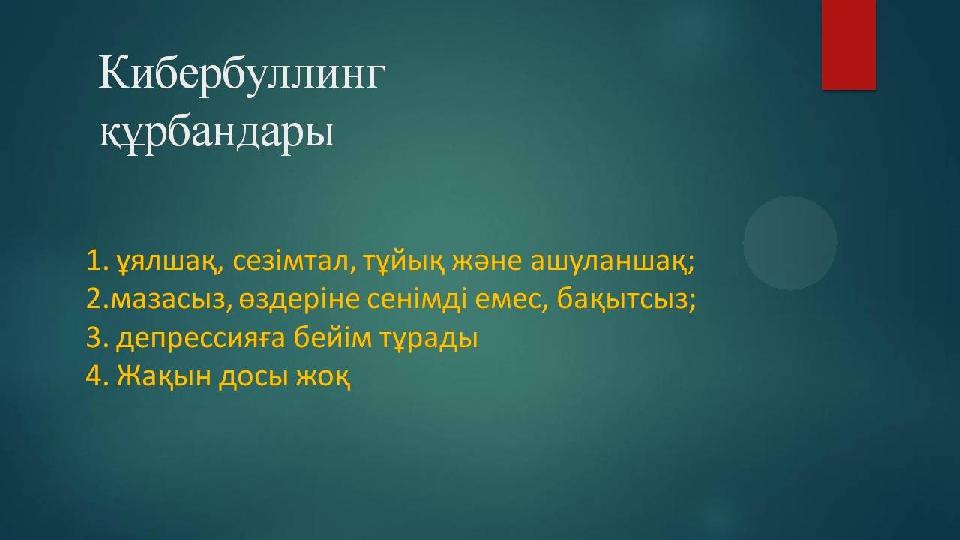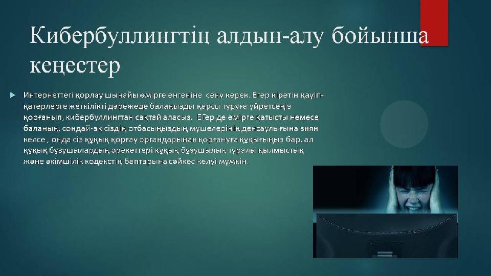 Егер сен кибербуллинг ке тап болсаң, не істеу керек? Кибербуллингке тап болған жағдайда сен қорқып, абыржып қалуың мүмкін. Ондай кезде мынадай әрекеттер жаса: әлеуметтік желіде сол адамды бұғатта әлеуметтік желінің әкімшісіне сен туралы айтылған постқа шағым келтір (әдетте ол үшін «report» батырмасын басу жеткілікті) ондай хабарламалар/посттарға жауап берме, әйтпесе жағдай ұшығуы мүмкін осы хабарламаларды/посттарды дәлел ретінде сақтап қой, яғни скриншот жаса бұл жағдайда сені қолдап, не істеу керектігі жөнінде ақыл-кеңес бере алатын ересектерге – ата- анаңа, қамқоршыңа, мұғаліміңе айт 111 жедел желісіне қоңырау шал немесе біздің форумда өз уайымыңмен бөліс біраз уақытқа интернеттен шығып, өзіңе ұнайтын нәрселермен айналыс (велосипед теп, қыдыр, киноға бар).