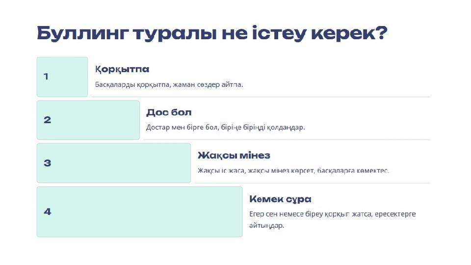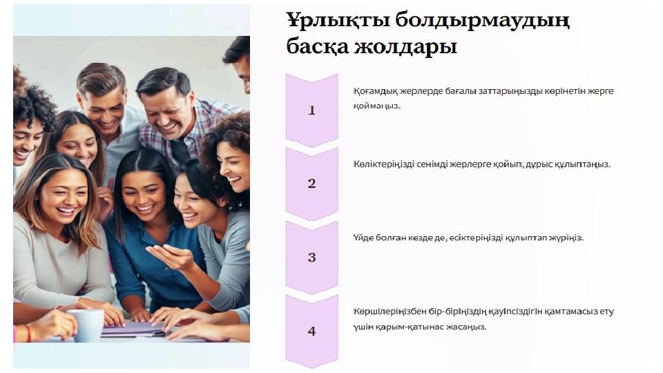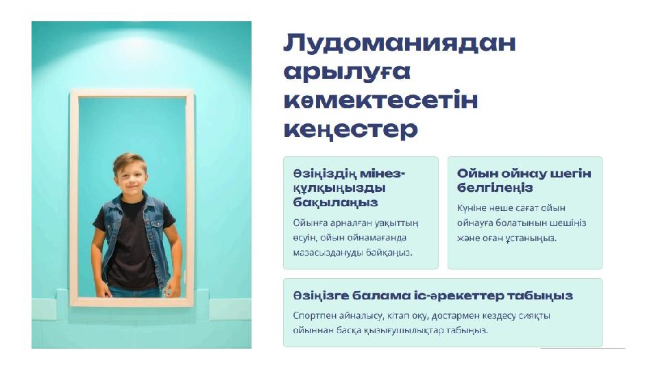•Егер сен қорқып немесе жамандық сезініп жатсаң, сенімді адамдармен бөліс. Зорлық-зомбылықтың барлық түрлері қабылдауға болмайды. Зорлық- зомбылықтың алдын алу •Ұрлықтың алдын алу үшін бағалы заттарыңды абайлап сақта. Қоғамдық орындарда бағалы заттарыңды көрсетпе. Ұрлықтан сақ болу •Ойынға тәуелді болу қаупін азайту үшін ойын уақытыңды шекте. Ойынды қызықты етудің басқа тәсілдерін ізде. Ойынға тәуелділік ЖАСТАРДЫҢ ҚӘУІПСІЗДІГІ