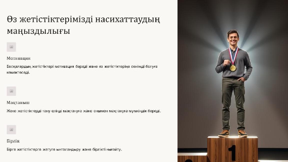 Жетістікке жетудегі ата-аналардың рөлі: Ынталандыру және қолдау 1 Мәрекелер Балалардың кішкентай жетістіктерін атап өту, мадақтау және сыйлық беру, олардың ынтасын арттырады. 2 Мақсаттар Балаларға мақсат қоюға көмектесу, олардың жетістіктеріне сену, олардың мақсаттарына жетуіне деген сенімді арттырады. 3 Қиындықтар Қиындықтармен күресу кезінде қолдау көрсету, балалардың қиындықтарды жеңуге деген сенімін нығайтады.