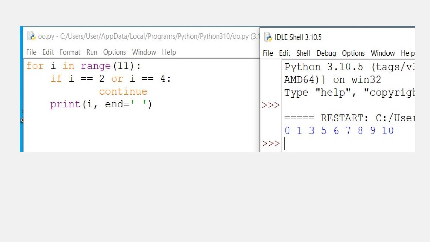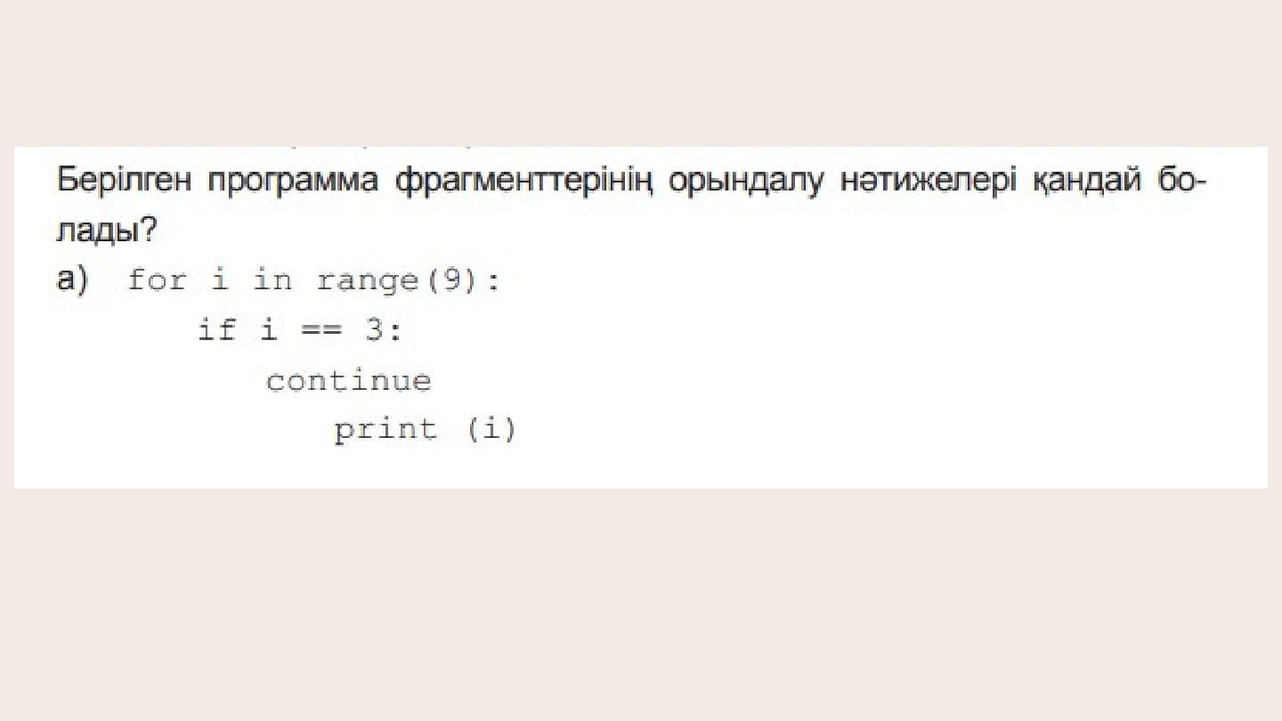 Жауабы: for i in range(11): if i == 2 or i == 4: continue print(i)