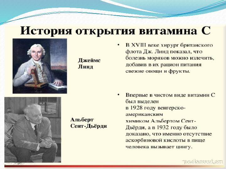 История открытия витамина С История открытия витамина С связана с цингой. Сильные, отважные моряки были бессильны перед цингой, которая к тому же часто вела к смертельному исходу. Болезнь проявлялась общей слабостью, кровоточивостью десен, вследствие чего выпадали зубы, появлялась сыпь, кровоизлияния на коже. Но все же был найден путь излечения. Так, моряки, следуя примеру индейцев, стали пить водный экстракт сосновой хвои, который является кладезем витамина С.