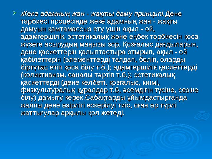 Жеке адамның жан - жақты даму принципі.Жеке адамның жан - жақты даму принципі. Дене Дене тәрбиесі процесінде жеке адамның жан - жақты тәрбиесі процесінде жеке адамның жан - жақты дамуын қамтамассыз ету үшін ақыл - ой, дамуын қамтамассыз ету үшін ақыл - ой, адамгершілік, эстетикалық және еңбек тәрбиесін қоса адамгершілік, эстетикалық және еңбек тәрбиесін қоса жүзеге асырудың маңызы зор. Қозғалыс дағдыларын, жүзеге асырудың маңызы зор. Қозғалыс дағдыларын, дене қасиеттерін қалыптастыра отырып, ақыл - ой дене қасиеттерін қалыптастыра отырып, ақыл - ой қабілеттерін (элементтерді талдап, бөліп, оларды қабілеттерін (элементтерді талдап, бөліп, оларды біртүтас етіп қоса білу т.б.); адамгершілік қасиеттерді біртүтас етіп қоса білу т.б.); адамгершілік қасиеттерді (коликтивизм, саналы тәртіп т.б.); эстетикалық (коликтивизм, саналы тәртіп т.б.); эстетикалық қасиеттерді (дене келбеті, қозғалыс, киімі, қасиеттерді (дене келбеті, қозғалыс, киімі, физкультуралық құралдар т.б. әсемдігін түсіне, сезіне физкультуралық құралдар т.б. әсемдігін түсіне, сезіне білу) дамыту керек.Сабақтарды ұйымдастырғанда білу) дамыту керек.Сабақтарды ұйымдастырғанда жалпы дене әзірлігі ескерілуі тиіс, оған әр түрлі жалпы дене әзірлігі ескерілуі тиіс, оған әр түрлі жаттығулар арқылы қол жетеді.жаттығулар арқылы қол жетеді.