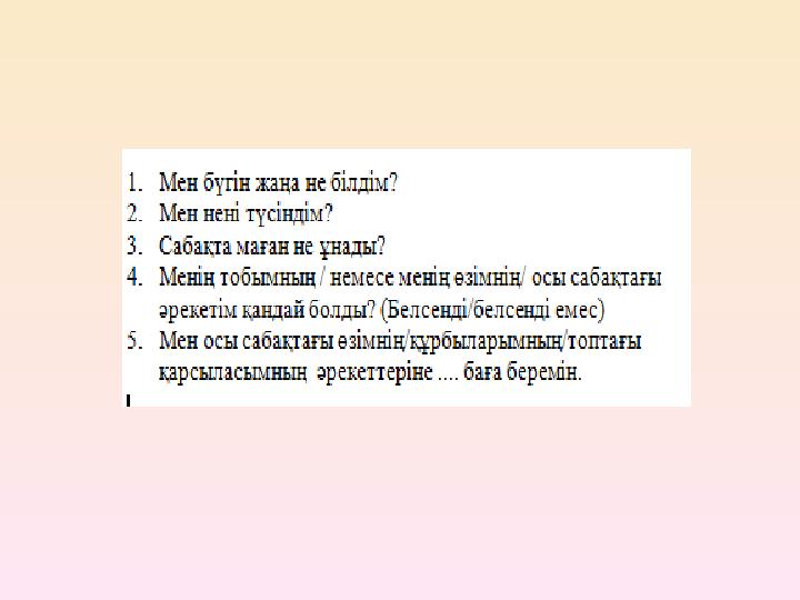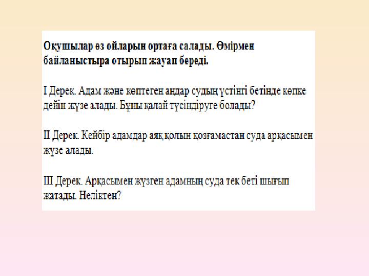 Сәйкестендір СәйкестендірДеректерді баянда Деректерді баяндаКесте толтыру Кесте толтыру «Суреттер сөйлейді» әдісі Бағалау «Қолпаштау» әдісі Мазмұн бойынша саралау. Бағалау «Қолпаштау» әдісі Мазмұн бойынша саралау. Бағалау «Бас бармақ» әдісі Қарым-қатынас бойынша саралау. Бағалау «Бас бармақ» әдісі Қарым-қатынас бойынша саралау. Денелердің жүзу шарттарын жаз Денелердің жүзу шарттарын ата Мысал келтір F a˃F A F a=F A F a˂F A Батады Жүзеді Қалқиды Тас, т.б. парафин, т.б. Ағаш, т.б. «Рефлексивті бестік» әдісі