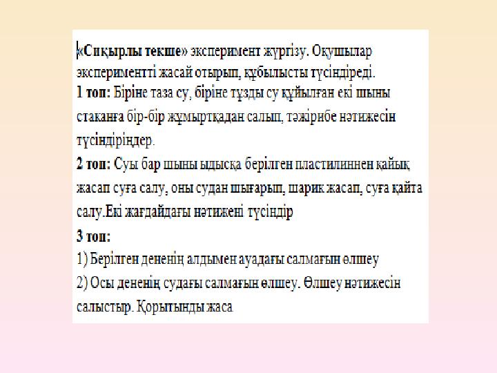 Топқа бөлу. Пәндерге байланысты терминдер арқылы Топқа бөлу. Пәндерге байланысты терминдер арқылыЖабық сұрақ Жабық сұрақ Жылдамдық бойынша саралау Жылдамдық бойынша саралау «Сиқырлы текше» эксперимент жүргізу Бағалау «Үш шапалақ » әдісі Мазмұн бойынша саралау. Бағалау «Үш шапалақ » әдісі Мазмұн бойынша саралау. «Ротация» әдісімен есептер шығару. Тапсырма бойынша саралау. Тапсырма бойынша саралау. Дескриптор 1.Есептің берілгенін жазады. 2.ХБЖ-не келтіреді. 3.Ауырлық күші мен Архимед күшінің формуласын біледі. 4.Есептейді.