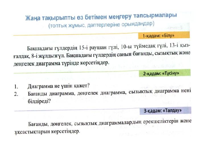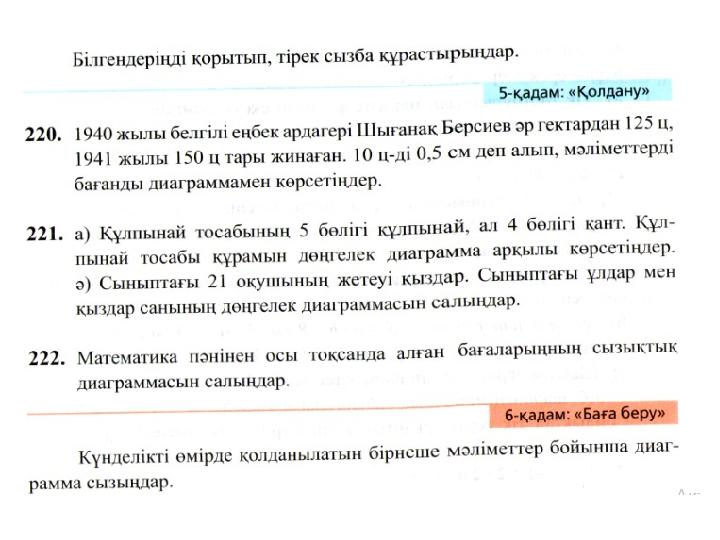 Білетін болсаңдар • Статистикалық мәліметтер бойында диаграммалар сызуды; • Бағанды, сызықтық және дөңгелек диаграммалар түрлерін. • Біліп үйренгендеріңді қолдануды қажет ететін проблемалық жағдаяттарды шеше аласыңдар .