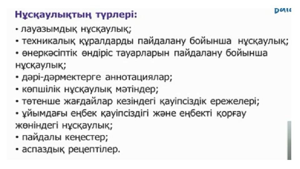 Сабақтың мақсаты: Тақырып бойынша сөздік қорларын дамытады, стильдік ерекшелікке сай нұсқаулық жаза алады.