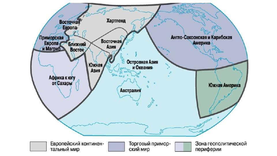 Елтану Кешенді географиялық аудандастыру Саяси-географиялық аудандастыру Әлемдік тұрғыдан алғанда дүниенің ортасы Еуразия (хартленд). Хартлендке Ресей, Еуропа, Қазақстан мен Орталық Азия жатады. «Әлемдік арал» Еуропа, Азия, Африка. Оның Ең ортасы «тарихтың географиялық білігі» Орталық Бұл белдеуге Еуразияның жағалық бөліктері сәйкес келеді. Ішкі жарты ай өркениеттің ең қарқынды дамитын зонасы болып табылады Ішкі жарты ай Бұл зона географиялық жағынан да, мәдени жағынан да сыртқы зона болып табылады. Сыртқы жарты ай (аралдық жарты ай)Х. Маккиндер хартленд күшін азайту үшін оның шеткі бөліктерін «тартып алу» саясатын жүргізу керек деген.Х. Маккиндердің саяси-географиялық аудандастыруы