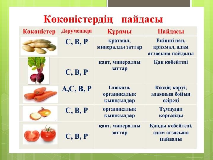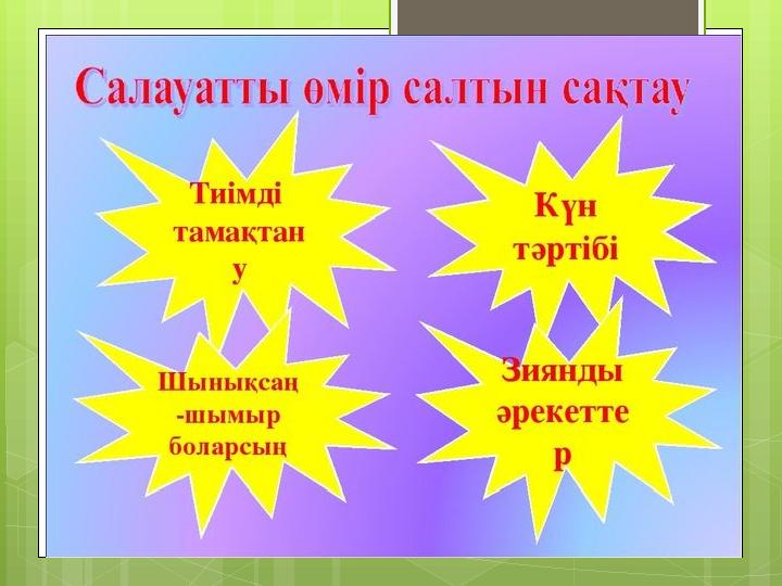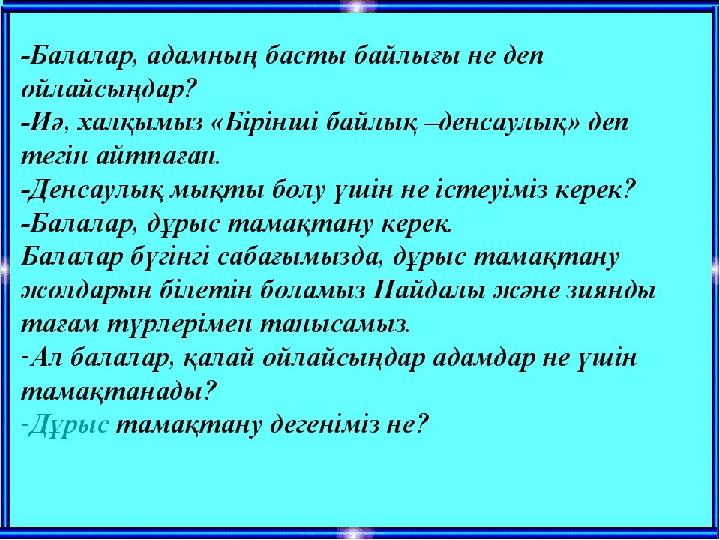 Мақсаты: Оқушылардың өз пікірлерін тыңдай отырып, қосымша мәліметтер бере отырып, денсаулық құндылығы, дұрыс тамақтану туралы түсініктерін кеңейту.