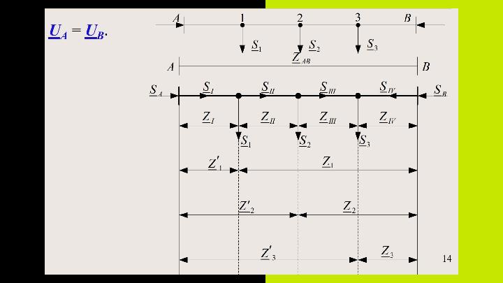 Тораптардағы жүктемелер si қуаттарының күрделі мәндерімен берілген сызық берілген. Zij желілерінің учаскелік кедергісі және UA қуат көзінің шиналарындағы кернеу де белгілі. Кейбір түрлендірулер жасай отырып, қарастырылып отырған желіні басқа түрде ұсынуға болады. Бұл жағдайда көздің кернеуі UA = UB.