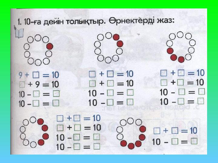 9+1=10 8+2=10 7+3=10 1+9 =10 2+8 =10 3+7 =10 10-9 =1 10-8 =2 10-7 =3 10-1 =9 10-2 =8 10-3 =7 6+4=10 5+5=10 4+6 =10 10-5 =5 10-6 =4 10-4 =6