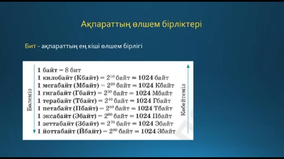 Екілік кодтау дегеніміз - екілік алфавитті қолдану арқылы ақпаратты ұсыну. Екілік кодта «0» жəне «1» символдары ғана қолданылады. 256 258 265 Бит, килобит, мегабит, гигабит. Байт, килобайт, мегабайт, гигабайт, т.б.