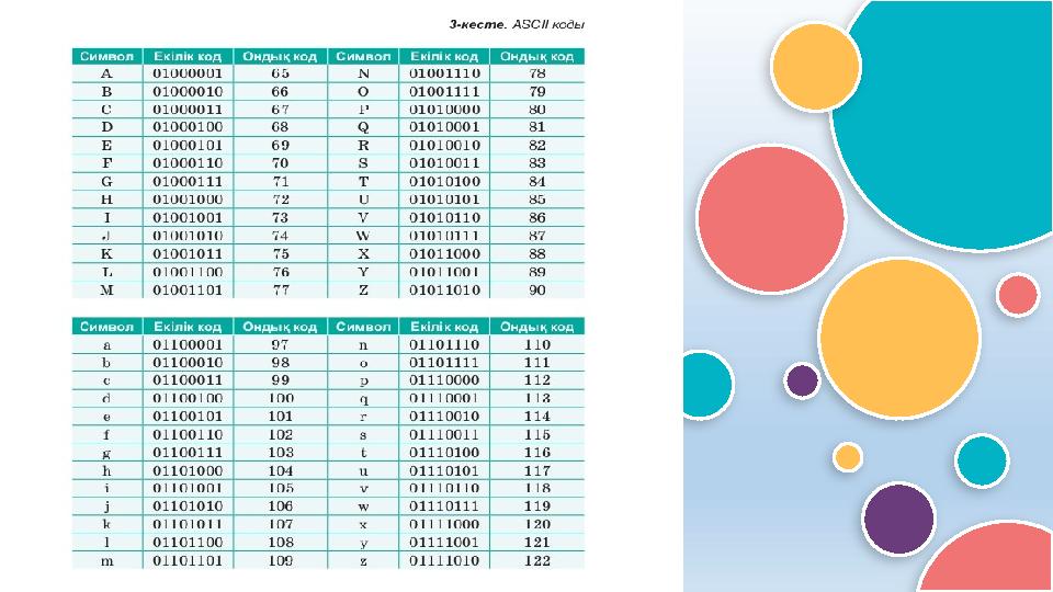 А деңгейі бойынша “Informatica” екілік кодта жазып көрейік I n f o r m a t i c a 01001001 01101110 01100110 01101111 01110010 01101101 01100001 01110100 01101001 01100011 01100001