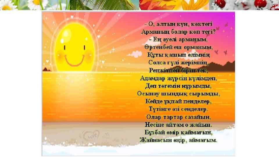Табиғат, қызығам сенің суретіңе, Бас ием сенің құдіретіңе. Тұрасың күллі әлемге нұр таратып, Тұтқасы тіршіліктің күн бетінде.