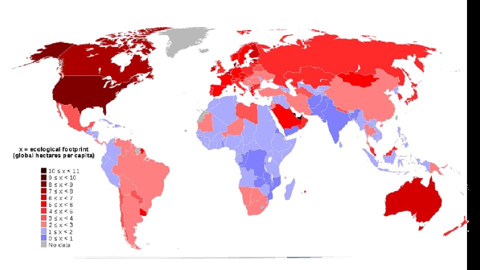 «Экологиялық із» Халықаралық экономикалық форум мәліметтері негізінде 2030 ж. қарай жекелеген елдерге өндіріс пен тұтыну көлемінде қажет ғаламшарлар саны Дүниежүзінің дамыған елдеріндегі орташа тұтынушының «экологиялық ізі» табысы төмен елдердегі тұтынушының көрсеткішінен 4 есе артық