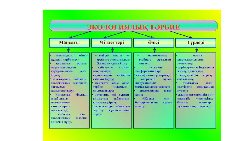 • Оқушыларға жабайы табиғат пен қоршаған әлемге деген сүйіспеншілік пен қамқорлықты тәрбиелеуде қарастырылған. Мемлекеттің экологиялық даму саласы бойынша саясатына, атап айтқанда «Жасыл экономика» бағдарламасына; экологиялық сауаттылыққа, табиғатқа, қоршаған адамдарға және өзіне; «адам- қоғам-табиғат» жүйесіне; табиғатты пайдалану және қоршаған ортаны қорғау саласындағы әр түрлі қызметке; кәсіби білім мен өнімді еңбекке; нарықтық экономика заңдарына құнтты және позитивті көзқарас қалыптастыру; экологиялық қауіпсіздік тәртібінің нормаларын сақтауға; еңбек қызметінде мақсатқа қол жеткізуге; мамандық таңдауына; үздіксіз білім негізінде кәсіби жинақылыққа саналы қатынас таныту.