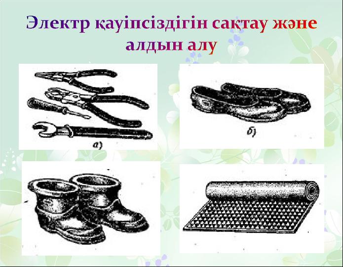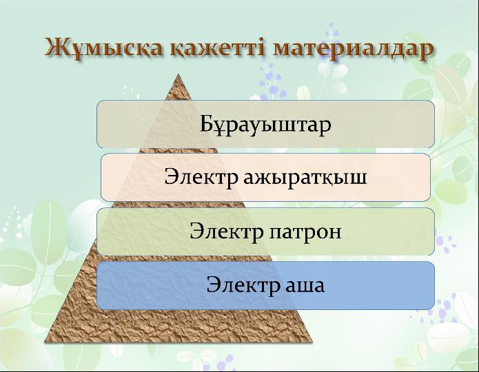 5.Өндipicme ток көзі ретінде нелерді пайдаланады? Өндірісте ток көзі ретінде гальваникалық элемент, аккумулятор немесе генератор пайдаланады. 6.Электр материалдарыны ң қатарына нелер жатады? Электр материалдарынь ң қатарына электр сымы, түтікшелер, оқшаулауыш таспа, бау т.б. жатады. 7.Электр т ұтынушыларға нелер жатады? Электр тұтынушыларға электр шамы, үтік, телевизор, тоңазыткыш т.б. жатады. 8.Қандай материалдар ток өткізбейді? Ток өткізбейтін материалдарды оқшаулауьпп деп атайды. Оларға пластмасса, әйнек, резеңке, кұрғақ ағаш, фарфор жатады.