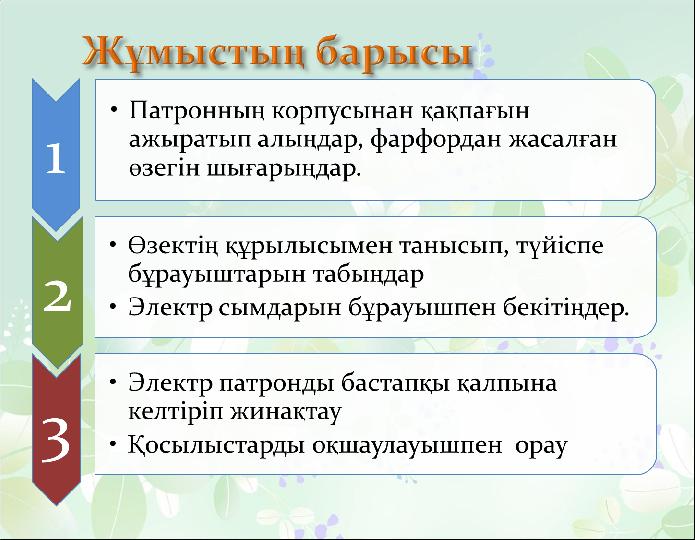 1.Электр патроны мен ашасының құрылысы-мен танысу, оларды мантаждау әдісін білу. 2. Электр тізбегін құрастырғанда, оны токтан ажыратуды ұмытпа. 3. Электр тізбегін тек мұғалімнің, рұқсатымен көмегімен қосу. 4.Электр құрастыруға арналған құралдар зақымданбаған болуы тиіс 5. Электр сымдарын оқшаулағанда оны мықтап бекіт.