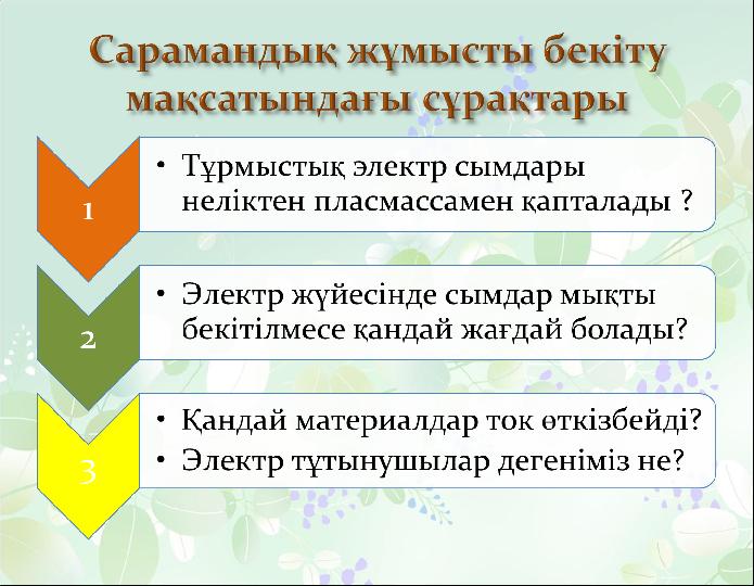 1.Қарапайым электр т ізбегі неше элементтен тұрады? 2.Электр тізбегін құрастыру неше амалдан турады? 3.Электр сымдарыны ң ішкі және сыртқы қабаты неден жасалады? 4.Электр аспаптарыны ң қатарына нелер жатады? 5.Өндipicme ток көзі ретінде нелерді пайдаланады? 6.Электр материалдарыны ң қатарына нелер жатады? 7.Электр т ұтынушыларға нелер жатады? 8.Қандай материалдар ток өткізбейді?