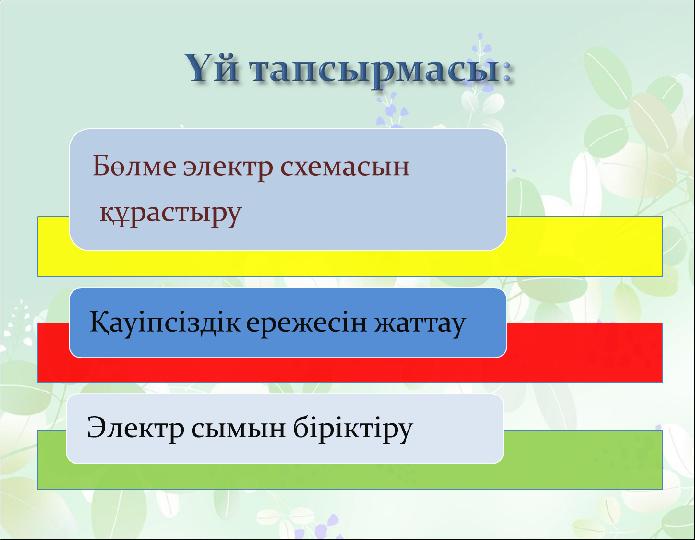 Оқушыларды қауіпсіздік ережесін сақтап жұмыс жасауға тәрбиелеу Оқушылардың білім дағдысын қалыптастыру, алған білімдерін практикамен ұштастыру, шеберлігін шыңдау. Білімділік Дамытушыл ықу Тәрбиелі к Электр техникалық жұмыстар бойынша алған білімдерін тиянақтау, қызыметтерін ажырата білуге, құрастыра білуге үйрету