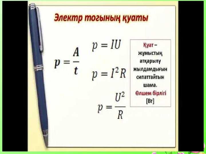 Қорытынды •1.Үтік неге қатты қызады,ал теледидар онша •қызбайды? •2.Қай құралдың қуаты үлкен деп •ойлайсыңдар? •3.Электр энергиясы қайда жұмсалды? •Қуат көп болса,не өзгереді? •Джоуль-Ленц заңының формуласы?