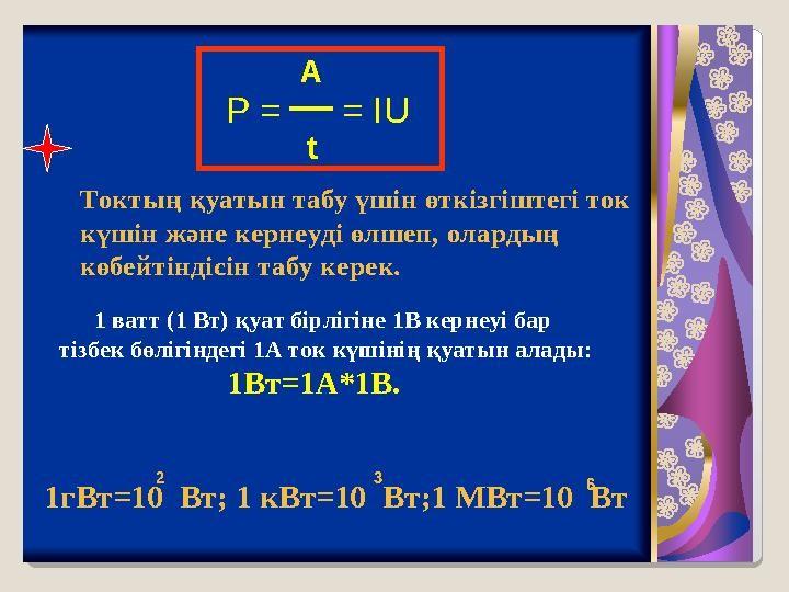 Оқу мақсатымыз: 8.4.2.12 – жұмыс және қуат формулаларын есептер шығаруда қолдану 8.4.2.13 – Джоуль-Ленц заңын есептер шығару үшін қолдану; Сабақтағы мақсатымыз: Алған білімдерін өмірде пайдала алады.Токтың жұмысы мен қуатына мысалдар келтіре алады және формулаларды пайдаланып есептер шығарады.
