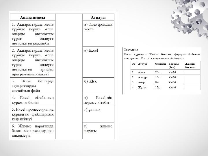 Электрондық кестелер жол нөмірлері жол нөмірлері жолжол бағандарбағандар бағандар атауыбағандар атауыбелсенді ұяшық белсенді ұяшық белсенсіз ұяшық белсенсіз ұяшық •мәтін •сандар •формулалар •уақыт •күні