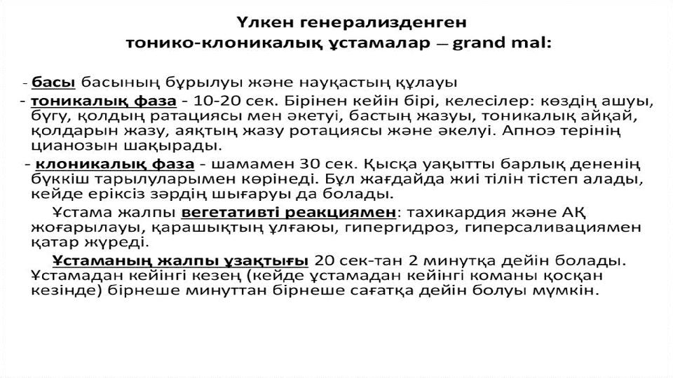Генерализацияланған ұстамалар Ми қыртысының екі жартышарынан бірдей патологиялық белсенділіктен туындайды. Тоникалық-клоникалық ұстамалар (үлкен ұстама): •Тоникалық фаза: Бұлшықеттер қатайып, дене толық қозғалыссыз қалады (құлау қаупі). •Клоникалық фаза: Бұлшықеттердің ырғақты тартылуы. •Жиі тіл тістеу, еріксіз зәр шығару. Абсанстар (кіші ұстамалар): Бірнеше секундқа сананың қысқа мерзімді «өшіп қалуы». Балаларда жиі кездеседі (науқас қозғалыссыз тұрып қалады немесе көзі бір нүктеге қарап тұрады). Миоклоникалық ұстамалар: Бұлшықеттердің жылдам, ырғақты тартылуы (қол, иық немесе аяқта). Атониялық ұстамалар: Бұлшықет тонусының кенет төмендеуі, құлап қалу. Сана бұзылмайды.