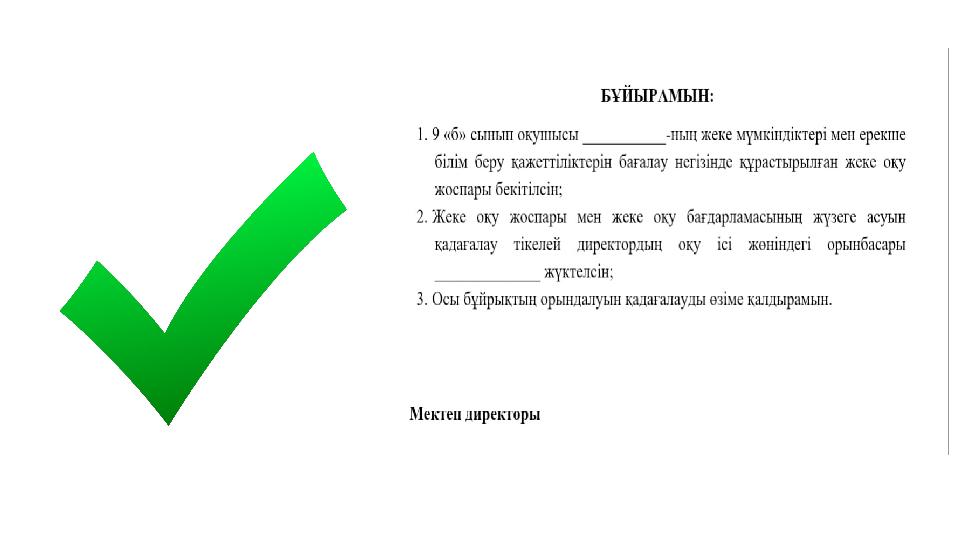 ПМПК ҚОРЫТЫНДЫСЫ МЕН МЕКТЕПТІҢ ПЕДАГОГИКАЛЫҚ КЕҢЕСІНІҢ ШЕШІМІМЕН ЖЕКЕ ОҚУ ЖОСПАРЫН ҚҰРУ ТУРАЛЫ БҰЙРЫҚ ШЫҒАРЫЛАДЫ .