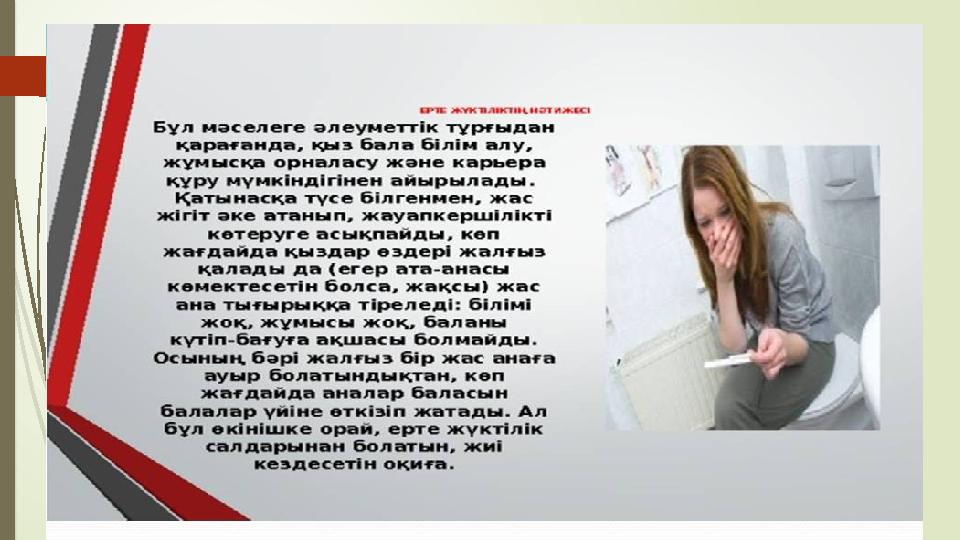 Ерте жүктіліктің қауіп-қатері Жас ана жүктілікті физикалық көтере алмайды. Жас анада қиын таңдау тұрады: аборт жасау немесе баланы қалдырса өзін ж ə не н ə рестені кауіп-қатерге тігеді. Толық қалыптаспаған организм жүктілікпен ж ə не босануды көтере алмауы мүмкін, сондықтан мерзіміне жетпеген н ə ресте немесе ақауы бар н ə ресте туылуы мүмкін.