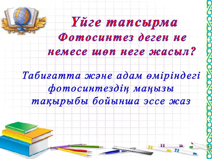 Сабақты бекіту тапсырмалары Тапсырма 1 Жеке тапсырма Тест 1.Өсімдікке жасыл түс беретін пигмент? А ) оттег і B ) су Г) хлорофил D ) көмірқышқыл газы 2.Фотосинтез үдерісінен кейін түзілетін зат? А) оттегі,глюкоза B) су Г) хлорофил D)көмірқышқыл газы 3.Фотосинтез формуласын көрсет А ) жары қ+глюкоза Г) хлорофил D ) көмірқышқыл газы B ) көмірқышқыл газы+ Су ( н 2 о) +жарық→ Оттегі о 2 + Глюкоза с 6 н 12 о 6 4.Фотосинтез терминін ғылымға енгізген орыс ғалымы? А) Роберд Гук B) Антони ван Левенгук D)Климент Аркадьевич Тимирязев 5.Күн нұрының қатысуымен болатын құбылысты ата? А) хлорофил B) фотосинтез Г) глюкоза D)көмірқышқыл газы