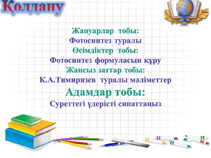 Сабақтың мақсаты: Фотосинтез үдерісін білу және үдеріс барысында түзілетін заттарды түсіндіру. Мақсатқа жету үшін: Фотосинтез үдерісінің мәнін білу қажет.
