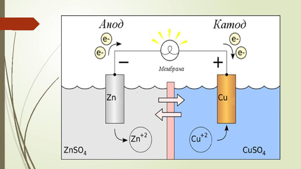Жаңа сабақ Гальваникалық элемент дегеніміз химиялық реакциялардың энергиясын тікелей электр энергиясына айналдыратын қондырғы. Гальваникалық элемент өзара сыртқы өткізгіш арқылы жалғасқан екі металл пластинкасы енгізілген және өзара жанасатын екі электролит ерітіндісінен тұрады. Электр тогын беретін гальваникалық элемент теңсіздік күйінде болады .