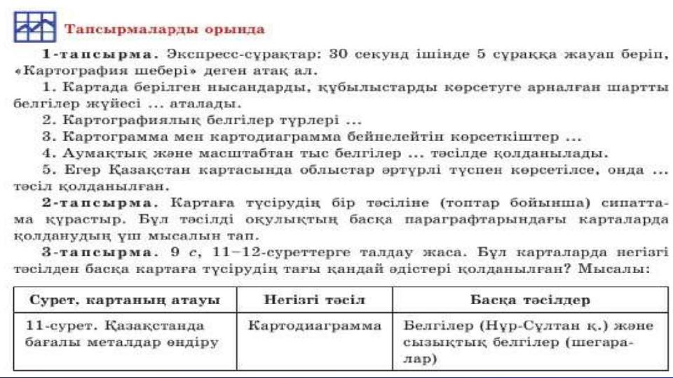 Географиялық нысандарды, үдерістер мен құбылыстарды картадан көрсету тәсілдері Оқу мақсаты: 9.2.1.1 қазақстандық маңызды географиялық нысандарды, процестер мен құбылыстарды карталардан көрсету барысында сипаттайды