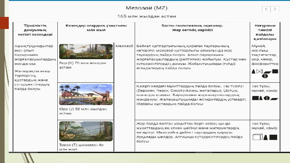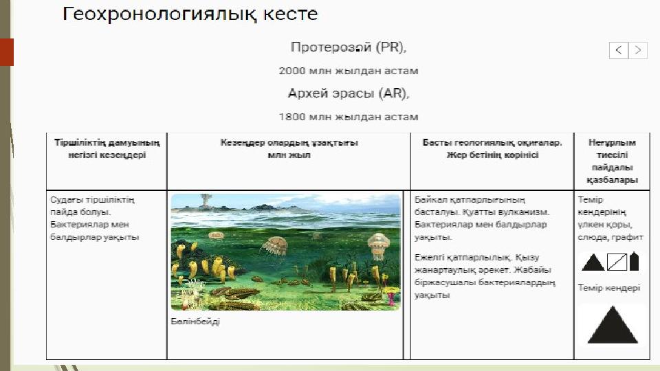 Алып бауырмен жорғалаушылардың өмір сүруі. Қазіргі кездегі мұхиттардың пайда болуы Жас таулардың пайда болуы. Ыстық климат. Алғашқы бауырмен жорғаушылардың және қосмекенділердің пайда болуы. Байкал қатпарлығының қалыптасуы. Қуатты вулканизм. Бактериалар мен балдырлар уақыты. Мезазой тауларының қирауы. Адамның пайда болуы. 1-тапсырма Геохронологиялық кесте мен атласты пайдаланып, берілген құбылыстардың қалыптасқан кезеңдерін анықтаңыз. Дескриптор: -Қазіргі мұхиттың пайда болу эрасын анықтайды -Байкал қатпарлығының қалыпатсу уақытын анықтайды -Жас таулардың пайда болу эрасын анықтайды -Адам пайда болған эраны анықтайды.