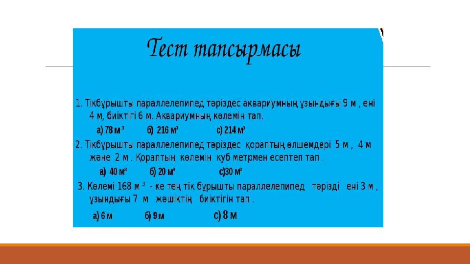тік бұрышты параллелепипедтің үш өлшемін табыңыз. (5