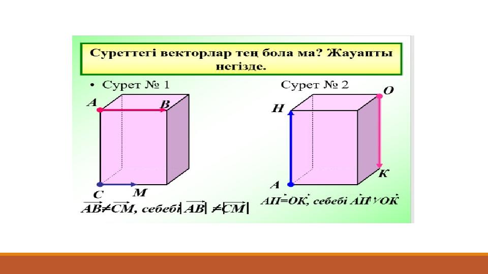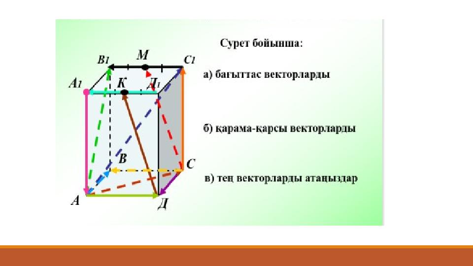 1. МК векторының координатасын тап, егер М(10; -4; 2), К(16; 2; -5) МК {16 – 10; 2 – (-4); -5 – 2} ж:: М К { 6; 6; -7}