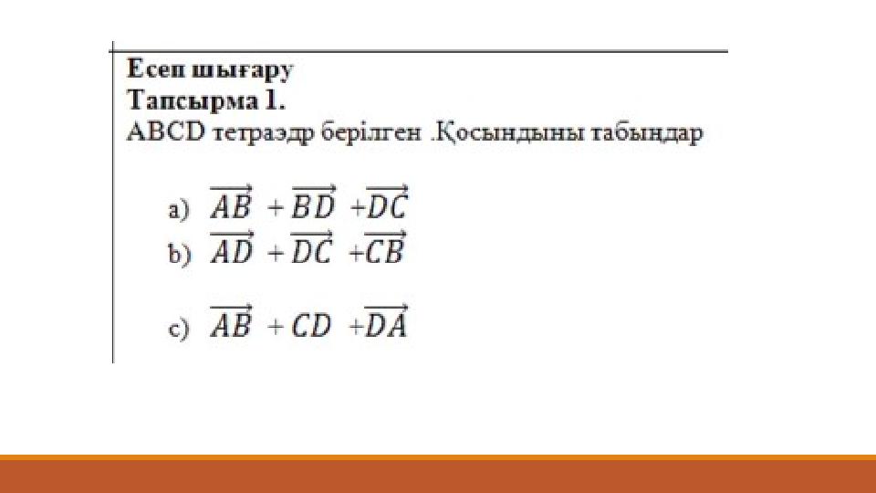 Векторларды қосу Егер a{х1; у1; z1}, ал b{х2; у2; z2}, a + b = c, c{ х1+х2; у1+у2; z1+ z2}